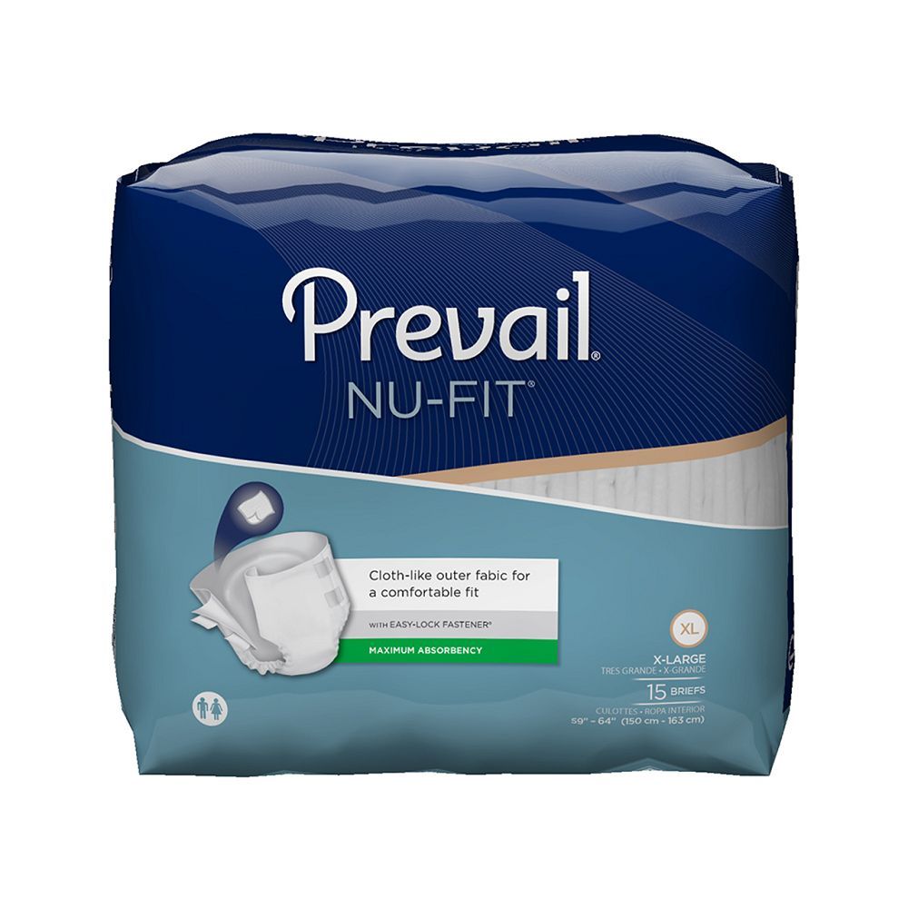 Prevail Nu-Fit Briefs feature Comfort-Shape Plus with gentle elastics that shape to your body for a more comfortable and discreet fit than standard adult diapers. The cloth-like outer cover is soft and comfortable for all-day wear while ventilated waist panels allow air to pass through, reducing heat buildup and promoting healthy skin. Moisture is quickly locked in upon contact for added leakage protection while the soft outer fabric provides additional all-day comfort.