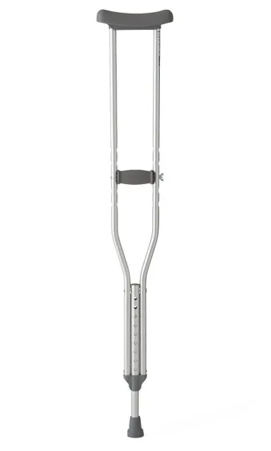 Standard aluminum pushbutton crutches feature a double extruded center tube that provides load-bearing strength where it's needed the most. The special foot piece utilizes durable rivets to secure the aluminum tubing from the inside, providing more stability than plastic connectors. Long, virtually unbreakable stair deflector helps protect against the crutch slipping on stairs and helps increase stress tolerance at all angles without cracking; nonskid rubber tips provide good traction. Weight capacity 300lbs.