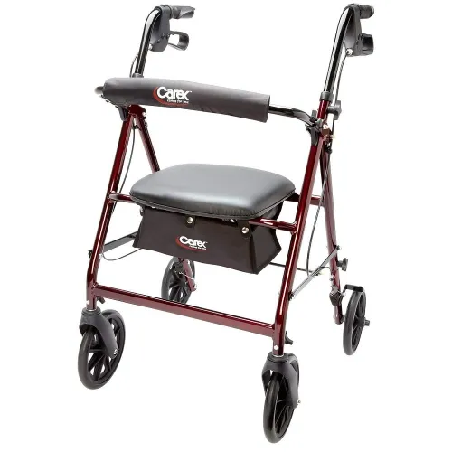 This top of the line aluminum folding walker features oversized 8" wheels, making it easier to get around. The lockable handbrakes offer safety, and the padded seat and backrest provide comfort during use. A convenient storage area under the seat safely holds your personal items. The walker folds easily for storage and transport, and the assembly is quick and tool-free. Weight capacty 300lb.