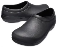 Crocs On-The-Clock Work Slip-On Clogs have enclosed toes and heels to meet workplace standards. Enhanced arch support and deeply cushioned footbeds offer Dual Crocs Comfort. Made with Crocs Lock slip-resistant treads, these Crocs for work are perfect for those at risk of falling. Fit is relaxed, with tapered fit in the back of the heel for a secured fit. Ideal for baristas, restaurant servers, and healthcare and service industry workers of every stripe.