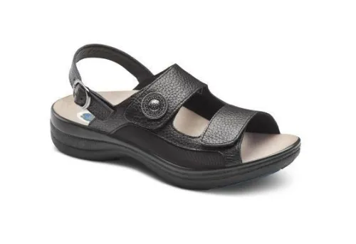 A new addition to our Open Comfort Collection, the Lana sandal is both comfortable and functional. With stretchable lycra sides, the sandal helps accommodate bunions and other foot deformities. Features include a stylish button accent, a removable footbed for custom orthotics, velcro closures over the forefoot and a buckled closure on the heel.